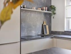 Dit type achterwand, zoals een composiet of keramische plaat, is niet alleen stijlvol maar ook praktisch. Er zijn geen voegen, het oppervlak is makkelijk schoon te houden en het sluit mooi aan bij moderne keukens waarin eenvoud en samenhang belangrijk zijn. Ook in een nis sluit een achterwand mooi aan. Door fronten, werkblad en achterwand op elkaar af te stemmen, ontstaat een keuken die rustig oogt en toch karakter heeft.
